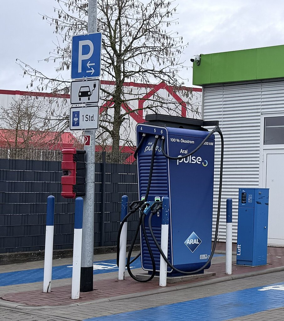 Genau dort werden die Ladesäulen von Aral mit dazugepackt, sozusagen als „Dual Use Area“, wohl in der Erwartung, dass sich Ladewillige und Luft- bzw. Saugbedürftige nur selten in die Quere kommen werden.