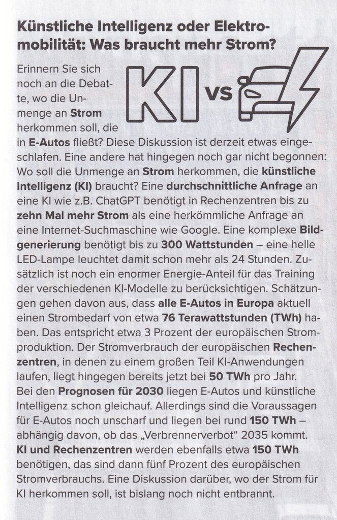 Dabei wird kritisiert, dass dieser große Energieverbrauch nur dem Elektroauto negativ angekreidet wurde, dieselbe Entwicklung bei KI aber noch nicht im selben Ausmaß thematisiert wird.